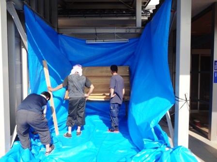 準備風景 提灯取り付け 旧つるやホテル   鶴の湯 本部・花火販売所設営